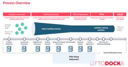 Ein Projekt startet immer mit einem Problem Interview, wo DOCK 6 den Fachbereich interviewt, um das Problem und die Anforderungen besser zu verstehen. Oftmals wird auch die Funktion von OTTO DOCK 6 nochmals erläutert, da Venture-Clienting, noch nicht sehr verbreitet ist.