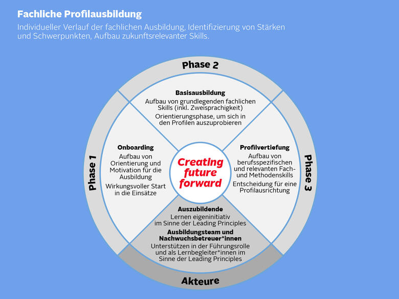 „Nach dem Onboarding beginnt die Basisausbildung, in der erste praktische Erfahrungen gesammelt und grundlegende fachliche Skills aufgebaut werden. Danach folgt die Profilvertiefung, in der sich die Azubis und Dualis auf spezifische Themen konzentrieren können, die zu ihrem Ausbildungsberuf oder Studiengang passen. Das Besondere dabei ist, dass die Einsätze und Teams selbst ausgewählt werden können. So können eigene Stärken und Interessen besser erkannt und zukunftsrelevante Kompetenzen entwickelt werden.“