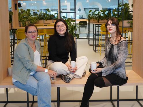 Drei Kolleginnen aus dem Bereich UX-Design sind im Social Space in einer lockeren Haltung sitzen auf einem Holzgerüst