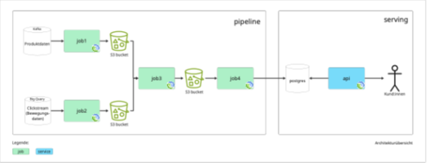 Die Scores stammen aus den Predictions unseres Deep Neural Networks. Grundlage sind Relevanzsignale und Bewegungsdaten unserer Kund*innen sowie die Produktdaten. Clojure-Jobs in AWS bereiten die Daten für das Modelltraining und die Vorhersagen auf.