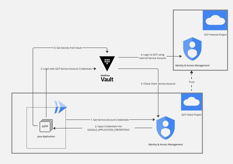 Durch eine Freischaltung dieses Service-Accounts auf das GCP-Projekt des Clients entsteht eine Vertrauensbrücke zwischen den GCP Projekten (Vault Service Account Projekt und Client Service Account Projekt). Vault kann den Service-Account des Clients überprüfen und den Zugriff gewähren. Vault stellt dann ein kurzlebiges Token aus, mit dem die Geheimnisse ausgelesen werden können.